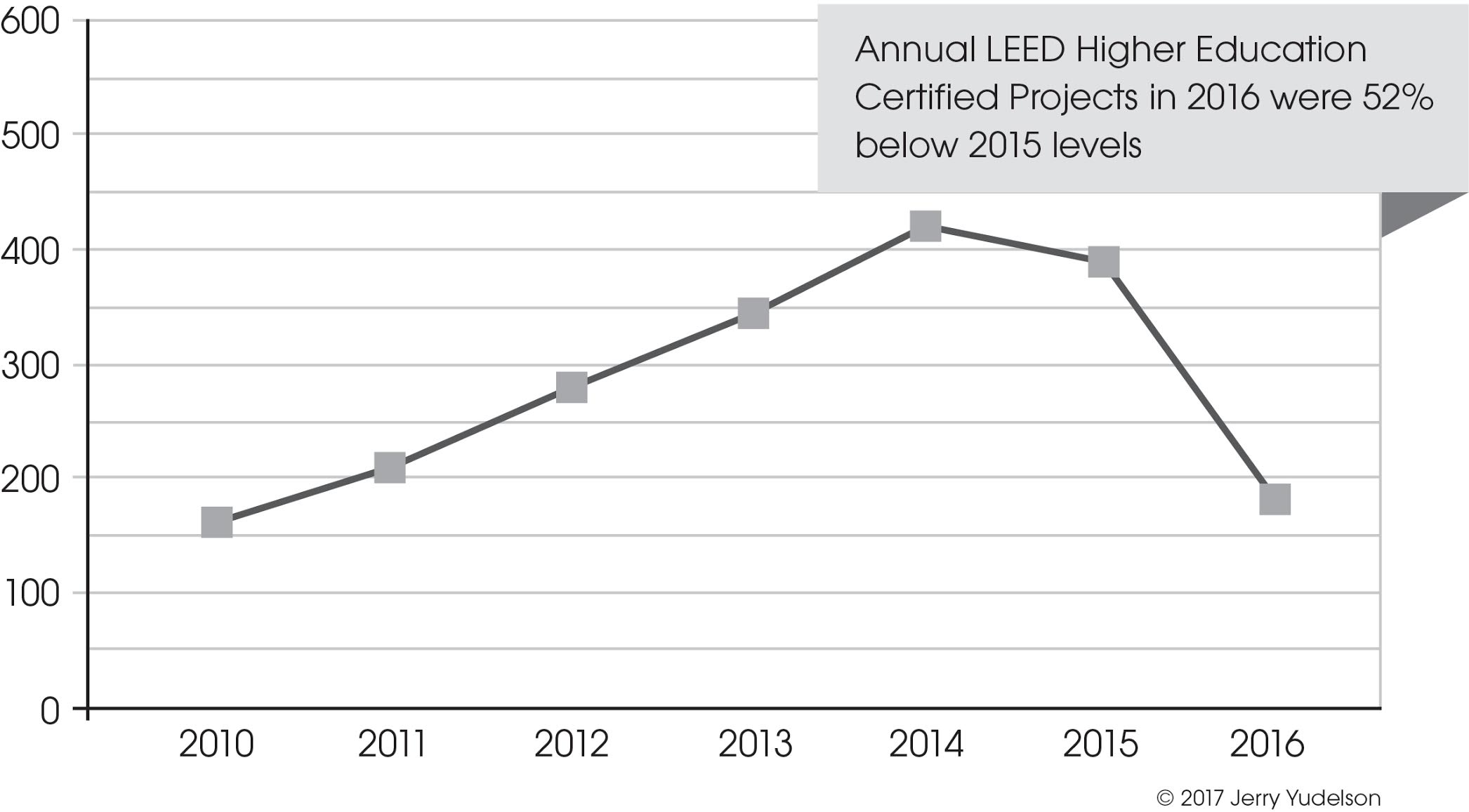 In higher education, LEED certifications in 2016 were less than half of those in 2015 and had reverted to 2010 levels. K12 education certifications in the US in 2016 declined by more than 25% from year earlier levels, to below 2011 certification levels. LEED for Healthcare certifications continued to slide lower, from 2013 highs.